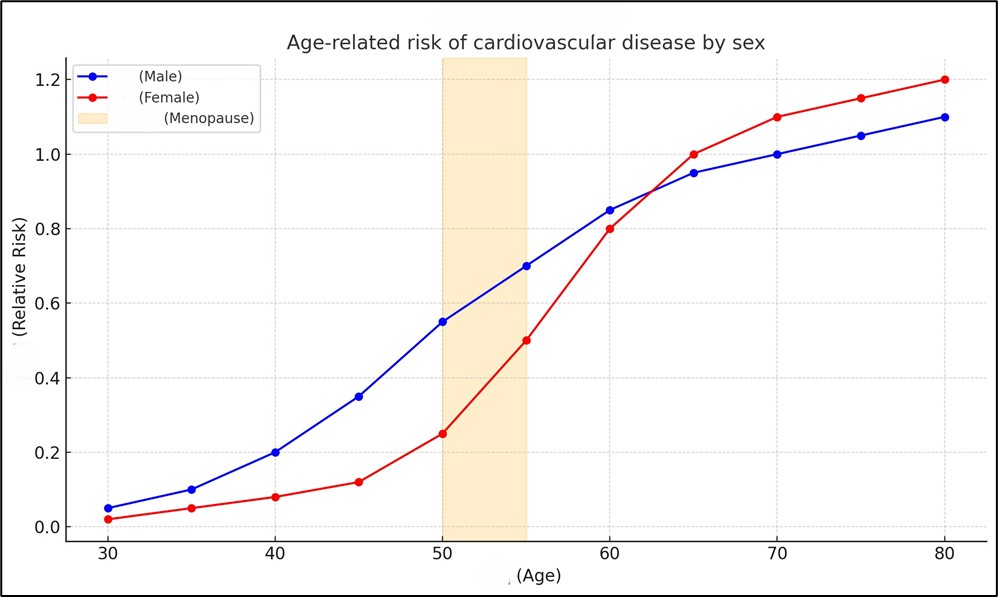 🎈 這個優勢一直維持到進入更年期:雌激素快速退落,心血管的健康度也極遽下降。心血管意外事件(CVD)也快速超越同齡男性,且一直維持到最後。